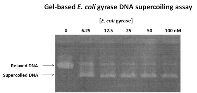 DNA topoisomerases such as bacterial topoisomerase II (gyrase) convert relaxed circular DNA into supercoiled DNA (DNA supercoiling reaction). The Gel-Based E. coli Gyrase DNA Supercoiling Assay is based on the principle that the supercoiled DNA and relaxed DNA are separated by agarose gel electrophoresis. Fluorescence-based DNA supercoiling assays in a 96-well pate format are also available for high throughput screening of gyrase inhibitors. For more information of the high throughput gyrase DNA supercoiling assays, please visit the website at http://www.profoldin.com/topoisomerase_assays_1.html.