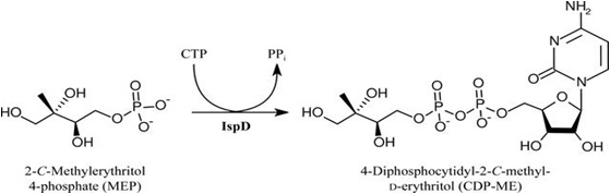 Methylerythritol phosphate cytidyltransferase (IspD) is one of the enzymes in the non-mevalonate pathway for isoprenoid biosynthesis that present in many pathogenic organisms and plants but absent in mammals. IspD is an attractive target for the development of novel antibiotics and herbicides. This enzyme catalyzes the formation of 4-diphosphocytidyl-2-C-methyl-D-erythritol from CTP and 2-C-methyl-D-erythritol 4-phosphate (MEP).