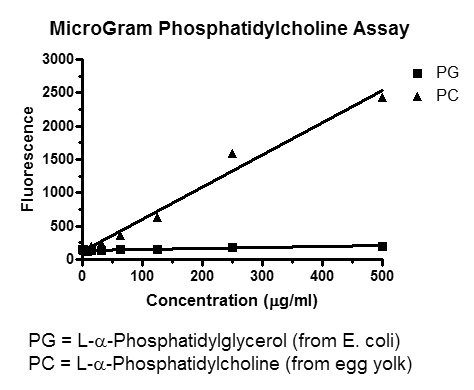 The MicroGram Phosphatidylcholine Assay Kit (Catalog number: MPC200K) is for measurement of L-α-phosphatidylcholine (PC) at concentrations of 0.005% (0.05 mg/ml) or higher. The assay is based on the principle that phosphatidylcholine interacts with the MPC reagent and enhances the fluorescence intensity at 535 nm (excitation at 485 nm). L-α-phosphatidylglycerol (PG) does not interact with the MPC reagent.
